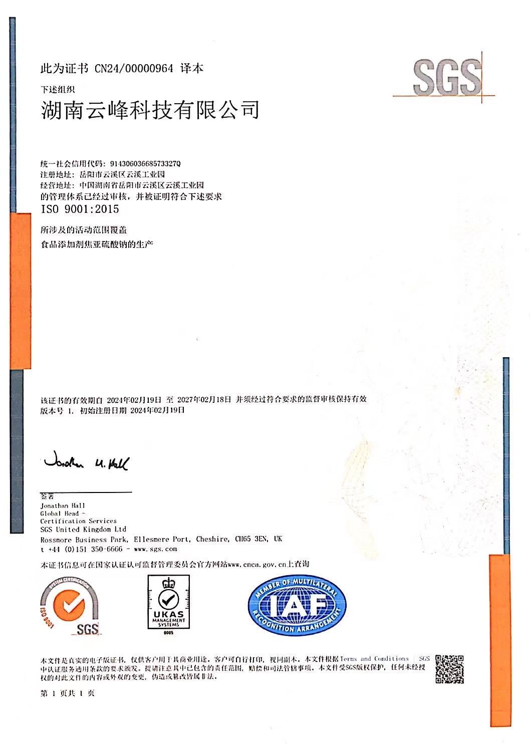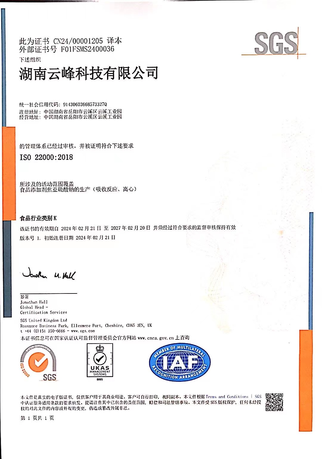 湖南云峰科技有限公司(以下簡稱云峰科技),是由長沙湘岳化工責任有限公司全額投資以生產焦亞硫酸鈉、亞硫酸鈉等亞硫酸鹽為主營業(yè)務的高科技企業(yè),具有六十多年的生產歷史,同時也是焦亞硫酸鈉的國家標準制定參與者。在行業(yè)內具有很大的影響力。現有職工八十余人。具有優(yōu)良的經營管理團隊和成熟的生產技術隊伍。由多位在化學、化工行業(yè)擁有豐富工作經驗的工程師及技術員團隊組建而成,致力于亞硫酸鹽產品的研發(fā)、生產和銷售。2020年公司對生產設備、安環(huán)設施及工業(yè)技術等進行了大規(guī)模的升級改造,使焦亞硫酸鈉和亞硫酸鈉的生產工藝更加先進,技術更成熟,產品質量更優(yōu)良。無論在生產工藝、設備、產品質量、清潔生產、節(jié)能環(huán)保和員工素質方面,均處于行業(yè)領先地位。公司的主導產品“云峰”牌焦亞硫酸鈉,歷史悠久,深受國內外客戶信賴,產品遠銷東南亞、歐美、非洲、南美洲等20多個國家和地區(qū),產品供不應求。